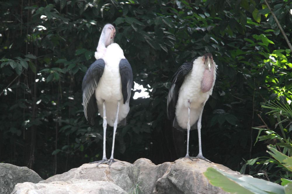 Two black and white Crane birds are standing in front of plant, photo taken at Singapore Zoo