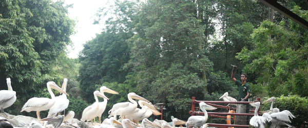 White, grey, Crane birds standing separately, photo taken at Singapore Zoo