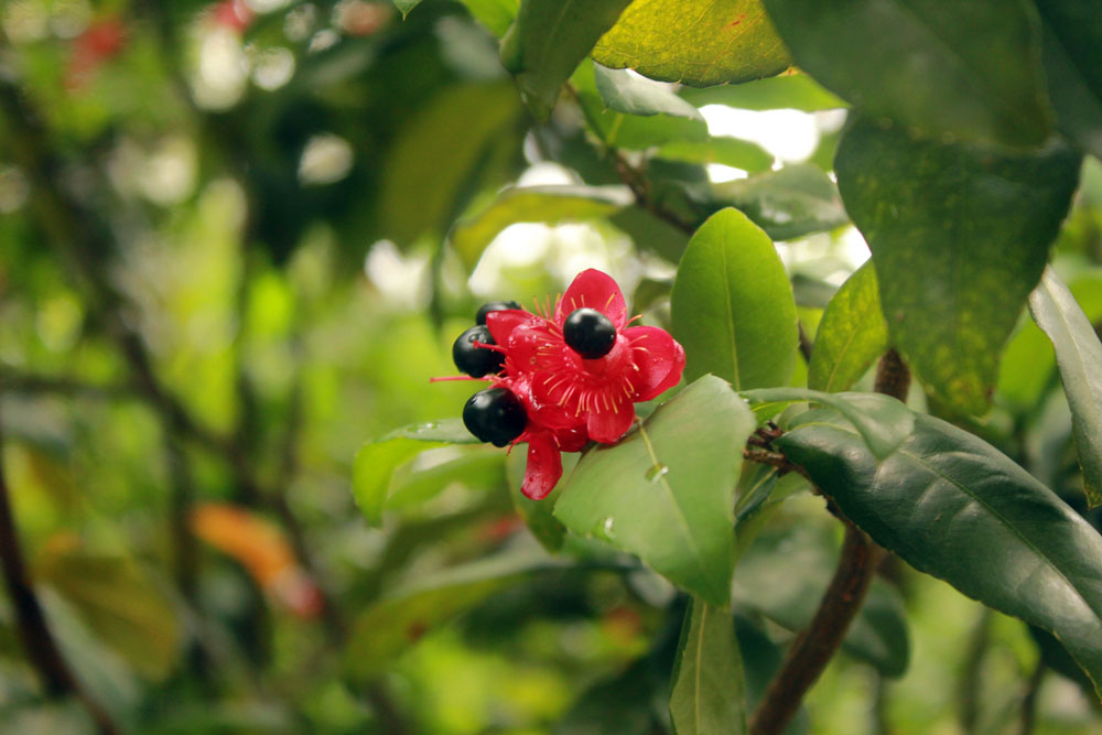 Red colour Ochna Serulata flower, photo taken at Singapore