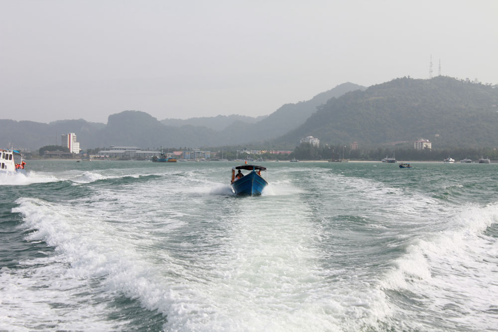 Blue colour ferry riding very fast, photo taken at Malaysia