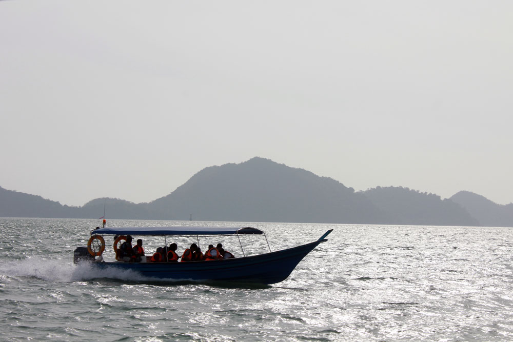 Passengers are travelling with life jacket in ferry at sea, photo taken at Malaysia